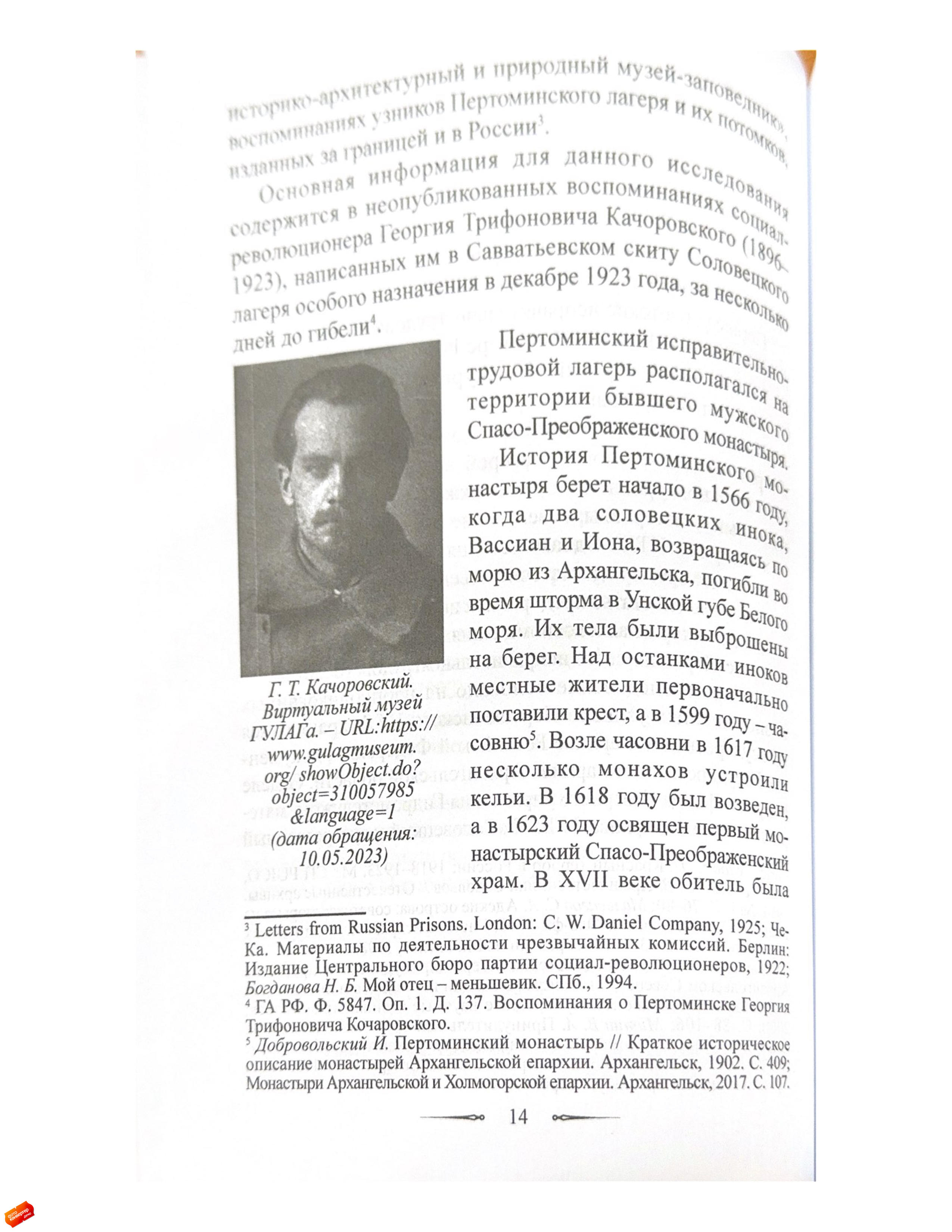 Статья посвящена истории Пертоминского исправительно-трудового лагеря (ИТЛ), существовавшего с 1921 по 1923 год в стенах закрытого Пертоминского Спасо-Преображенского мужского монастыря.Исследование основано на неопубликованных воспоминаниях социал-революционера Георгия Трифоновича Качоровского (1896–1923), написанных им в декабре 1923 года и освещающих условия содержания в Пертоминском ИТЛ, а также отношения заключенных между собой и с руководством лагеря.