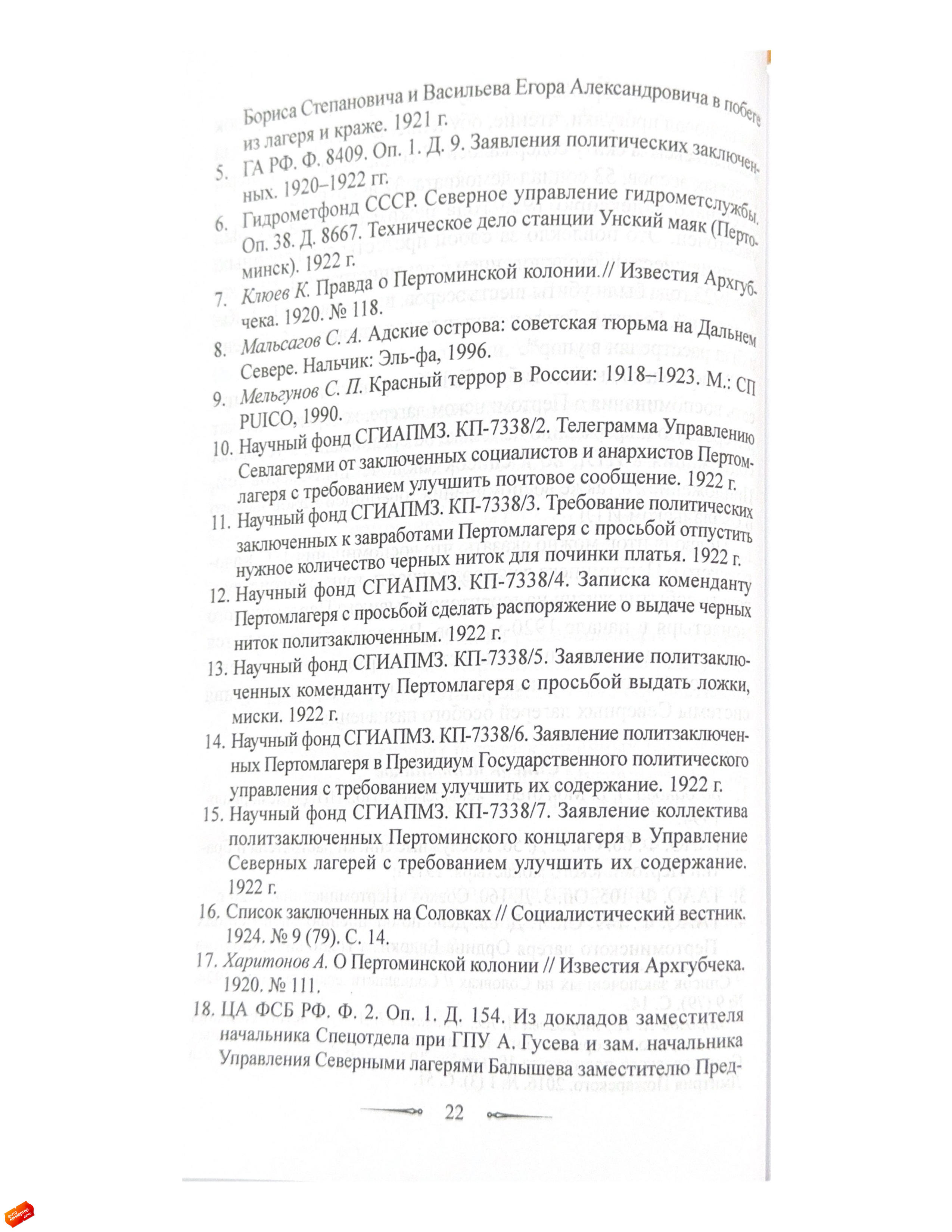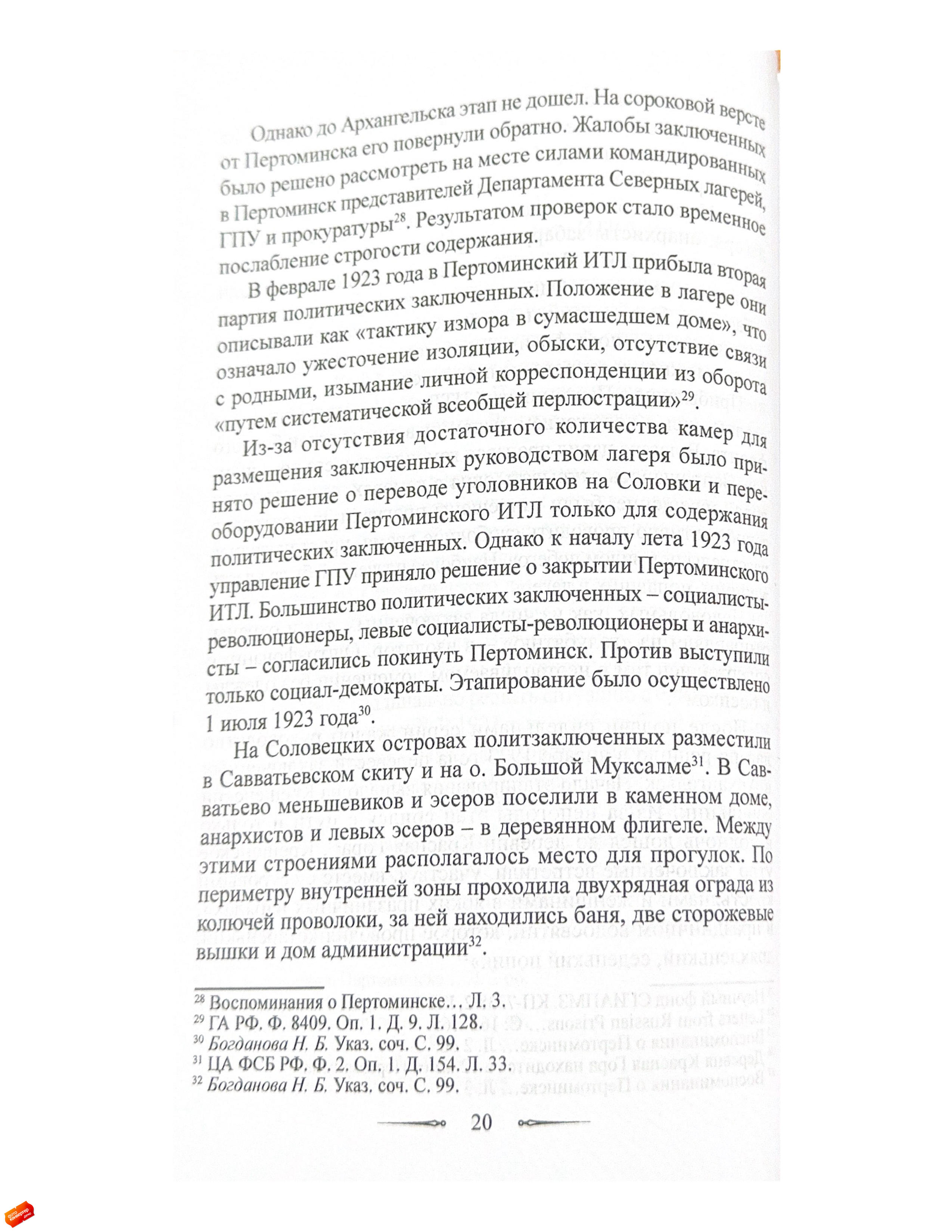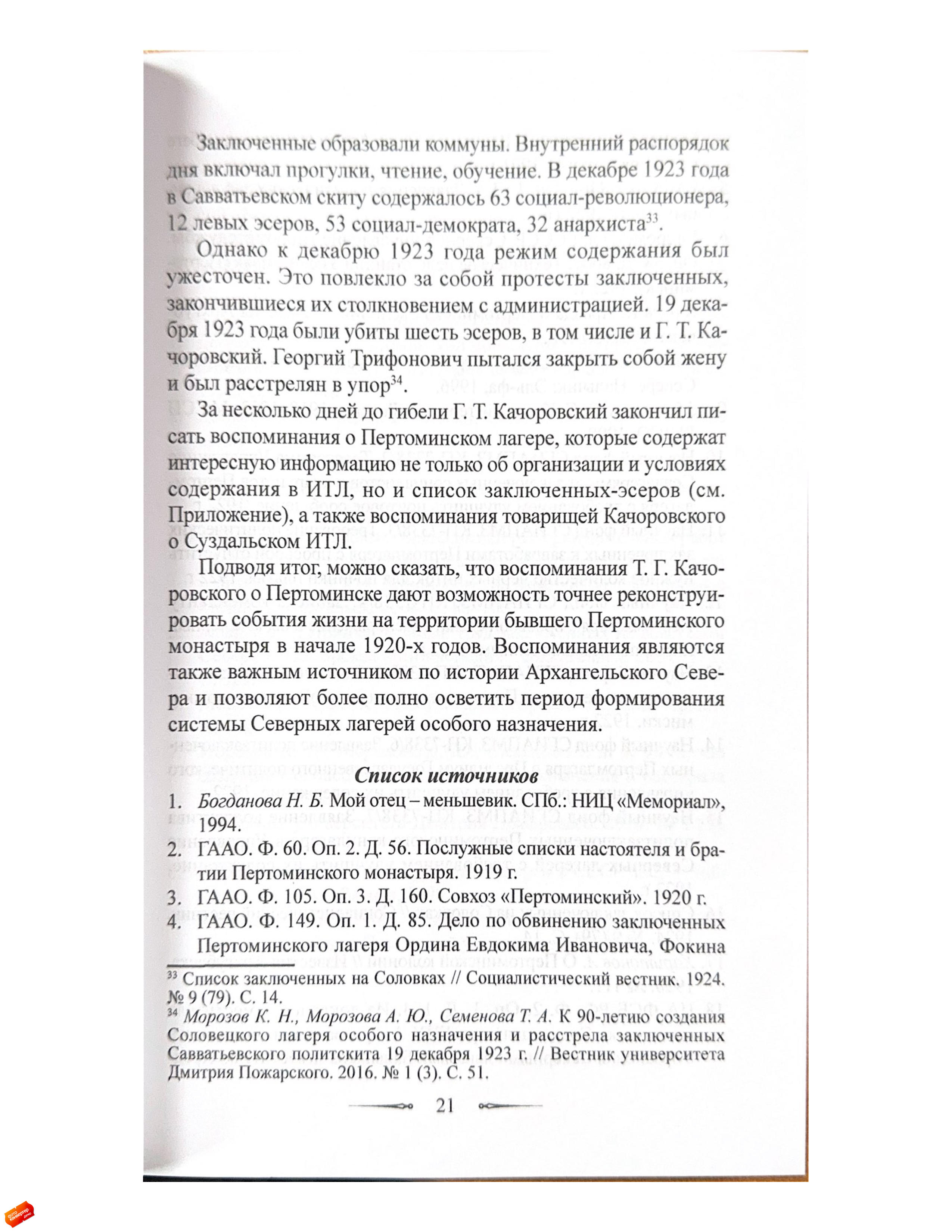 Статья посвящена истории Пертоминского исправительно-трудового лагеря (ИТЛ), существовавшего с 1921 по 1923 год в стенах закрытого Пертоминского Спасо-Преображенского мужского монастыря.Исследование основано на неопубликованных воспоминаниях социал-революционера Георгия Трифоновича Качоровского (1896–1923), написанных им в декабре 1923 года и освещающих условия содержания в Пертоминском ИТЛ, а также отношения заключенных между собой и с руководством лагеря.